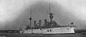 That year's long-distance cruise went to the Mediterranean Sea that year, and began on 6 August 1912.[21] The ship cruised in the western Mediterranean later that year, along with her sister Hertha. The old cruiser Geier was also in the region.[22] As the Bulgarian army was poised to march on Constantinople during the First Balkan War, the Great Powers deployed a naval force to ensure the safety of foreign nationals in the Ottoman Empire. Vineta and the battlecruiser Goeben were sent to Constantinople as part of this force, Goeben arriving there on 15 November and Vineta joining her on 9 December. At that time, the Germans created the Mediterranean Division, which included both ships. The international fleet sent ashore a force of around 3,000 officers and men. The force was withdrawn to Crete after a ceasefire seemed imminent, but by February 1913 fighting again broke out, and the island was seized by Greece. In the meantime, Vineta had gone to Alexandria, Egypt, on 2 January, where she began the voyage back to Germany, arriving in Kiel on 5 March. FK Wilhelm Adelung relieved Sievers; he served as the ship's final captain. She took another group of cadets on a voyage in the Baltic Sea shortly thereafter.[20][23]