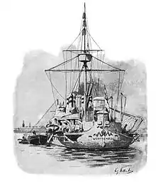 The ship returned to active service with the fleet on 2 May 1890, under the command of KzS Alfred von Tirpitz,[16] when she joined I Division during the annual maneuvers. The eight ships of I and II Divisions simulated a Russian fleet blockading Kiel, which was defended by torpedo boat flotillas.[17] On 30 September, Tirpitz departed the ship. Württemberg was in reserve during the 1891 maneuvers, but returned to I Division in 1892.[18] She was recommissioned on 8 August that year under the command of KzS Alfred Herz in preparation for the autumn maneuvers to replace Oldenburg, which had to be withdrawn from the maneuvers due to engine problems. During the latter part of the maneuvers, Württemberg accidentally collided with the old armored frigate Friedrich Carl off Stolpmünde. Württemberg's steering gear was disabled in the collision and the central battery ironclad Deutschland had to take her under tow back to Kiel for repairs. In November, Korvettenkapitän (KK—Corvette Captain) Max von Fischel took command of the ship.[14]