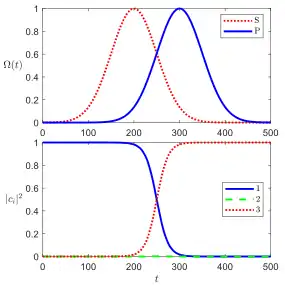 Consider the description of three level Ʌ atom having ground states and (for simplicity suppose that the energies of the ground states are the same) and excited state . Suppose in the beginning the total population is in the ground state . Here the logic for transformation of the population from ground state to is that initially the unpopulated states and couple, afterward superposition of states and couple to the state . Thereby a state is formed that permits the transformation of the population into state without populating the excited state . This process of transforming the population without populating the excited state is called the stimulated Raman adiabatic passage.[5]