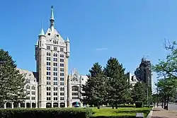 The building and the land it sits on, which is located at the foot of State Street along Broadway, have a varied history. The oldest part of the city, it was here that several of Albany's earliest city halls sat, along with the New York State Legislature in the 18th century. The Albany Plan of Union in 1754, presided over by Ben Franklin, was held here.[2] The land was once along the Hudson River's banks, over time being infilled, including in 1911 as part of the construction of the Plaza.[7] The city of Albany purchased and consolidated the land ownership that allowed the D&H to build the building and the city to have a park in front surrounded by a street that acted as a loop for the trolleys running on State Street. Public access was allowed to the Hudson River through the central tower and by way of a tunnel to the other side of the D&H tracks.[8] The design by Marcus T. Reynolds was based on the Nieuwerk annex of the Cloth Hall in Ypres, Belgium.[2][9]