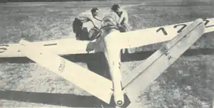 The SZD-14X Jaskółka M was developed from the SZD-8bis Jaskółka (Swallow) for research into the construction, control and characteristics of 'V' or butterfly tail surfaces.[2] Using the airframe of the second prototype SZD-8 a 'V' tail was added to the rear fuselage, with arrangements for the balance of the surfaces and the angle between them to be adjusted as required.[1] The designer was Tadeusz Kostia, the constructor was Władysław Okarmus.[3]