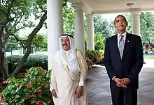 Sabah established Kuwait as the key mediator in the Qatar diplomatic crisis that began in 2017, meeting with Saudi and Emirati officials before leaving for Doha to discuss the rift with Qatari leaders.[23] His ongoing efforts were publicly supported by Qatar[26] and other interested parties from the region as well as the U.S., UK, France, and Germany.[24] At the beginning of September 2017, Sabah discussed the situation with top officials in Washington, D.C., including U.S. President Donald Trump, who "hailed his efforts" to mediate and "applauded Kuwait's 'critical contributions to regional stability'".[27] There were some questions from the boycotting countries about any preconditions.[28] French President Emmanuel Macron stated French support for Sabah's mediation efforts after a meeting in Paris on 15 September 2017, reiterating statements of support for the initiative.[29][30] Trump and Sabah had a third meeting at the White House on 5 September 2018.[31]