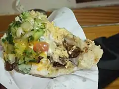 Sabich or sabih (Hebrew: סביח [saˈbiχ]) is a sandwich of pita or laffa bread stuffed with fried eggplants, hard boiled eggs, chopped salad, parsley, amba and tahini sauce.[1] It is an Iraqi Jewish dish that has become a staple of Israeli cuisine, as a result of Iraqi Jewish immigration to Israel.[2] Its ingredients are based on a traditional quick breakfast of Iraqi Jews. Sabich is sold in many businesses throughout Israel.
