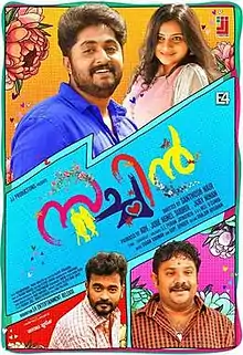 Sachin is a 2019 Indian Malayalam-language film directed by Santhosh Nair and written by S. L. Puram Jayasurya. It stars Dhyan Sreenivasan, Aju Varghese, Hareesh Kanaran, Renji Panicker, Ramesh Pisharody, Appani Sarath, Maniyanpilla Raju, Anna Rajan, Maala Parvati, Aabid Nassar, Reshmi Boban and Sethu Lakshmi.[1] Sachin is a romance film in the backdrop of cricket.[2][3] The story revolves around a boy who born on the auspicious day when cricketer Sachin Tendulkar hit century. After watching Sachin's performance, Viswanathan (Raju) got excited and named his son as Sachin. The film was released on 19 July 2019.
