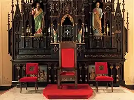 The church features an open interior without columns. There is an extensive amount of woodwork in the interior, including the altars, pews, ceiling, wainscoting, and the gallery frontal. There are four sets of oak pews across the width of the church. The vaulted ceiling is supported by hammer beams. The reliefs below the old high altar depict the sacrifice of Able, Abraham and his son Isaac, and the priest Melchizedek. The three Old Testament images are found in the Roman Canon. The statues of St. Peter and St. Paul were added later. Gold reliquaries that contain relics of various saints are in nooks on either side of the reredos. The shrine of the Blessed Virgin Mary on the left side of the church contains statues of St. Benedict on the left and St. Thomas Aquinas on the right, that were added in 1902. At the base of the altar is a relief of the Dormition of the Virgin. The St. Joseph shrine contains statues of St. Ignatius of Loyola on the left and St. Anthony of Padua on the right that were also added in 1902. At the base of the altar is a relief of Joseph on his deathbed with Mary and Jesus at his side. Initially, the bishop's throne was placed in the archway on the left side of the sanctuary. The large stations of the cross are bas reliefs with wood frames that line the sidewalls of the church. They were installed in 1892.