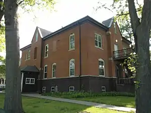 The parish school was established in 1859 in a frame building that was first used as the parish rectory.[3] This building was enlarged for more classroom space and for living quarters for the Sisters of Charity of the Blessed Virgin Mary who began teaching in the school in 1861. In the school's early years there was usually a layman who taught the older boys in addition to the Sisters. Among them was M.V. Gannon who would go on to become an attorney of some merit.[32] A new brick school building was built between 1870 and 1871.