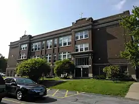 The third school building was constructed in 1914 for $104,093.44.[34] Bishop Davis dedicated the building on January 17, 1915. It was designed by Davenport architect Arthur Ebeling.[35] During the pastorate of Msgr. Marvin Mottet in the 1990s the parish school merged with St. Alphonsus School in the west end for several years and formed John Paul Academy. Both parishes then continued to sponsor their own schools until 2004 when it was no longer feasible to operate separate schools. Once again the parishes joined together and with Holy Family School in central Davenport to form All Saints School. The former Holy Family School building was used by the school.[36] Parish-based religious education classes were held in the Sacred Heart School building until it was torn down in the summer of 2017.[37] A ceremony was held before the demolition.[38]