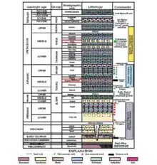 Stratigraphy graph of the Safaniya oil field explaining where the source rock, oil reservoirs and seal traps exists.