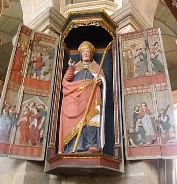 A similar shuttered niche or triptych features Saint Thégonnec with scenes from his life painted on the shutters.[4]