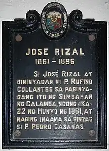 The church baptistery, where Rizal was baptized on June 22, 1861 by the then parish priest of Calamba Rufino Collantes and his godfather Pedro Casanas, is a recognized National Historical Landmark (Level 1).[2] The declaration was made by virtue of Resolution No. 2 of the Philippine Historical Commission (now National Historical Commission of the Philippines) on August 19, 1976 under Section 4 of the Executive Order No. 260 dated August 1, 1973 and amended by Executive Order No. 375 dated January 14, 1974.[3] The original baptismal font was restored including original church items and reliquaries during Rizal's time.[1] A transcript of Rizal's existing baptismal record is displayed on the left side of the baptistery entrance. The original baptismal records including the canonical books were lost on September 28, 1862 when Calamba Church was burned.[4]