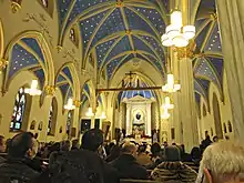 The church was subsequently extensively remodeled under the direction of Duncan Stroik, professor of architecture at the University of Notre Dame. The marble side altars were reconstructed. An altarpiece by Leonard Porter Studios depicts the Assumption, framed by a reredos.[5] John Canning Studios did the decorative painting of stars on the ceiling and stenciling.[6]