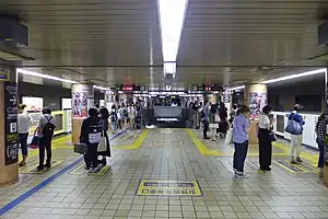 The station is rather large and contains many businesses such as restaurants and shops. There are three sets of gates corresponding to three exits: the Central Exit, the East Exit, and the West Exit. Past the West Exit are exits 1, 2, 7, and 8. Exit 3 and Exit 6 are between the Central Exit and the West Exit. Past the East Exit are exits 4, 4A, and 5.[5]