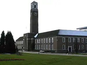 The site selected on Chorley Road in Swinton had previously been occupied by Swinton Industrial School.[6][lower-alpha 2] The foundation stone for the new town hall was laid by the mayor on 17 October 1936.[3] The new building was designed by architects Percy Thomas and Ernest Prestwich in the neo-classical style after they had won a national design competition.[3] It was built by J. Gerrard and Sons at a cost of £80,000 and officially opened by the Deputy Leader of the Labour Party, Arthur Greenwood MP, on 17 September 1938.[3] The most striking feature of the design was the clock tower, 125 feet (38 m) in height, with clock faces on each side, 9 feet (2.7 m) in diameter.[3] Percy Thomas was awarded the Royal Institute of British Architects (RIBA) Gold Medal for his work in 1939.[8]