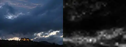 In computer vision, a saliency map is an image that highlights the region on which people's eyes focus first. The goal of a saliency map is to reflect the degree of importance of a pixel to the human visual system. For example, in this image, a person first looks at the fort and light clouds, so they should be highlighted on the saliency map. Saliency maps engineered in artificial or computer vision are typically not the same as the actual saliency map constructed by biological or natural vision.