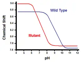The second method utilizes nuclear magnetic resonance spectroscopy to calculate the free energy of the salt bridge. A titration is performed, while recording the chemical shift corresponding to the protons of the carbon adjacent to the carboxylate or ammonium group. The midpoint of the titration curve corresponds to the pKa, or the pH where the ratio of protonated: deprotonated molecules is 1:1. Continuing with the T4 lysozyme example, a titration curve is obtained through observation of a shift in the C2 proton of histidine 31 (Figure 5). Figure 5 shows the shift in the titration curve between the wild-type and the mutant in which Asp70 is Asn. The salt bridge formed is between the deprotonated Asp70 and protonated His31. This interaction causes the shift seen in His31’s pKa. In the unfolded wild-type protein, where the salt bridge is absent, His31 is reported to have a pKa of 6.8 in H2O buffers of moderate ionic strength. Figure 5 shows a pKa of the wild-type of 9.05. This difference in pKa is supported by the His31’s interaction with Asp70. To maintain the salt bridge, His31 will attempt to keep its proton as long as possible. When the salt bridge is disrupted, like in the mutant D70N, the pKa shifts back to a value of 6.9, much closer to that of His31 in the unfolded state.
