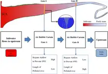 The seawater intrusion (SWI) into rivers can lead to many negative consequences, especially on agricultural activities and live ecosystems in upstream areas of rivers. There are many solutions developed to prevent or reduce the negative effects of Seawater intrusion. One of the sustainable solutions for rivers is using air bubble curtains that can completely solve SWI issues in rivers.[10]
