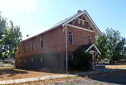 Salubria Lodge No. 31 is a historic Masonic building located at 85 W. Central Street in Cambridge, Washington County, Idaho, United States.[2] Built in 1922 to replace an earlier meeting hall destroyed by fire, it is a two-story building made of red brick and concrete with a sloped roof over an attic space designed by Watkins & Thompson. Above the entrance are two stained glass windows depicting the emblem of the Masonic order. A metal roof covering has been added to protect the original wooden roof from heavy snowfall.