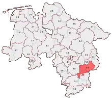 Salzgitter – Wolfenbüttel is located in southeastern Lower Saxony. As of the 2021 federal election, it comprises the independent city of Salzgitter, the entirety of the district of Wolfenbüttel, and the Samtgemeinde of Lutter am Barenberge and municipalities of Langelsheim, Liebenburg, and Seesen from the district of Goslar.[1]