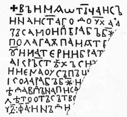 "Au nom du Père et du Fils et du Saint-Esprit, moi, Samuel, serviteur de Dieu, je fais mémoire de mon père, de ma mère et de mon frère sur ces croix. Voici les noms des défunts: Nicolas, serviteur de Dieu; Ripsimé et David. Écrit en l'an de la création 6501, indiction VI."