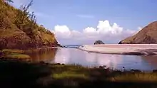 - Anawangin Cove: It is a crescent shaped cove with a pristine white sand beach. What makes the place unique is the unusual riddle of tall pine-like trees flourishing round its vicinity. In fact they are not pine trees; they are agoho trees, a species endemic to the Philippines, some Southeast Asian countries and north-eastern parts of Australia.[19][20] There are no roads leading to Anawangin. It is only accessible by a 30-minute boat ride from Pundaquit, San Antonio, or by a six-hour trek through hot, open trails thru the Pundaquit range. The cove's relative isolation has kept it free from development. Just behind the beach is the pine forest and a marsh, where there are natural springs feeding to the sea. The area is home to a number of bird species.[21]