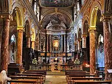 The church was noted for the monastery of Ss. Ciriaco e Niccolò (Saints Cyriacus and Nicholas), which was attached to it. Hülsen traces the origin of this monastery to the tenth century, citing a document from 972 that refers to monasterium sancti Christi martyris Cyriaci atque Nicolai confessoris, quod ponitur in Via Lata.[nb 1] Armellini states that the name of Saint Nicholas was added to the monastery because there was a church dedicated to him nearby (S. Nicolaus de Pinea), which was eventually subsumed by the monastery complex.[1] Hülsen, on the other hand, writes that the additional dedication was due to the translation of some of St. Nicholas' relics in the tenth century, while acknowledging the existence of the church that Armellini mentions.[3]