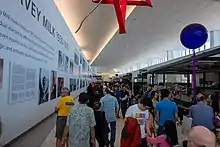In April 2018, the San Francisco Board of Supervisors and mayor Mark Farrell approved and signed legislation renaming Terminal 1 after deceased gay rights activist and former member of the San Francisco Board of Supervisors Harvey Milk, and planned to install artwork memorializing him. This followed a previous attempt to rename the entire airport after him, which was turned down.[102][103] Following the art and photo installation, the renamed terminal was opened to the media and public for preview tours in advance of its official opening on July 23, 2019.[90] Harvey Milk Terminal 1 is the world's first airport terminal named after a leader of the LGBTQ community.[90]