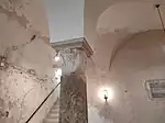 The main facade is elevated compared to the current road level and encompasses a two-storey central body with an arched portal. At the ends of the main facade, an additional floor exists that corresponds with the lateral bodies of the complex. The ground floor is characterized by a covered porch with groin vaults, supported by round arches with stone archivolts, upheld by square pillars.[17]