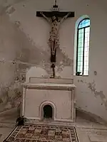 The architecture is characterized by its single lancet windows and an apse, which is decorated with traces of frescoes in the lateral areas. The frescoes were made by the artist Giovanni Luca De Luca (son of Giovanni Luca de Magistro) between 1564 and 1578. The left apse is frescoed with the images of Saint Andrew and Saint Peter while another represents the resurrection of Christ.[5][8]