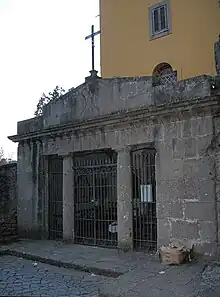 The same altar of the Crucifix was thus built at the end of the eighteenth century out of devotion to these two Calabrian priests, and it does not present any notable details of attention, also because it was remodeled at various times: the Secular Franciscan Order, for example, had its own coat of arms in white marble on a blue field affixed in the oval of the tympanum.[16] Between 1823 and 1824 the same canon Fumasoni Biondi who had financed the construction of the facade donated a life-size wooden crucifix to the altar and asked Massimo d'Azeglio, who was vacationing in Marino at the time, to make a pictorial frame for the sacred image.[20] Moreover, the painter, a future president of the Council of Ministers of the Kingdom of Italy, was helped in the work by two brigands who had taken refuge in the sanctuary to escape arrest,[20] a sign that it was possible for common criminals to have the right of asylum in the sanctuary. Currently, both the crucifix, which was probably moved before World War II to the basilica of St. Barnabas and replaced with a 19th-century polychrome wooden crucifix of medium size,[21] and the fresco have been lost. Marinese historian Girolamo Torquati believes that the Most Holy Crucifix of Marino was originally displayed in the sanctuary, an image that began to work miracles in June 1635,[26] and was moved to the church of the Holy Trinity, where it is still kept, by the religious congregation of the Clerics Regular Minor in June 1637.[27]