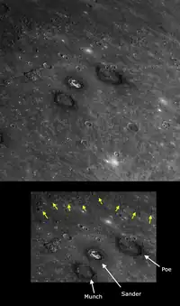 Sander is a crater on Mercury within Caloris Basin. It has dark walls and bright patches on its floor. Unlike the rays of Bashō crater, the bright areas are not believed to be immature, but they are inherently bright.[1] It is named after the German photographer August Sander (1876–1964).[2]