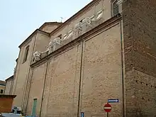 Among the internal decoration now in the church. The paintings for the 1st and 2nd altars on right are by Aureliano Milani. The 3rd altar has an early 14th-century Crucifixion scene with polychrome wood statues of the Virgin, John the Baptist. A canvas of the Massacred of the Innocents (1640) was painted by Giovanni Battista Razzani. The canvas depicting the Immaculate Conception and Saints James and Erasmus of Capua (1670) was painted by Cristoforo Serra. The gilded stucco altarpiece was completed by Marcantonio Fava. It was part of a polyptych whose main wooden panel is the Disputation of the Immaculate conception now housed in Brera. The upper sections of the apse now have a copy of Genga's Annunciation (circa 1500), while the original is in the Cesena Cathedral museum.[1] There is also a painting by Bartolomeo Coda.[2]