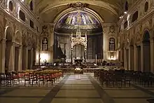 The ceiling of Cappella dei Ponziani was decorated God the Father with evangelists (1470) by Antonio del Massaro (Antonio da Viterbo or il Pastura). The Cappella delle Reliquie was frescoed and provided with an altarpiece by Luigi Vanvitelli. The nave is frescoed with the Apotheosis of Santa Cecilia (1727) by Sebastiano Conca. The church contains two altarpieces by Guido Reni: Saints Valerian and Cecilia and a Decapitation of Saint Cecilia (1603).[5]