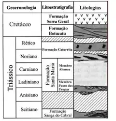 4. 1 2 Horn, B. L. D.; Melo, T. M.; Schultz, C. L.; Philipp, R. P.; Kloss, H. P.; Goldberg, K. (2014-11-01). "A new third-order sequence stratigraphic framework applied to the Triassic of the Paraná Basin, Rio Grande do Sul, Brazil, based on structural, stratigraphic and paleontological data". Journal of South American Earth Sciences. 55: 123–132. Bibcode:2014JSAES..55..123H. doi:10.1016/j.jsames.2014.07.007. ISSN 0895-9811.