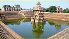 At the centre of the pond is Vasantha Mantapa, also known as karanji (fountain) mantapa, a symmetrical pillared tower which is built in Indo-Arabic style of architecture. It is built using granite, brick and mortar.[3] The design of this multi-levelled tower, which covers an area about 34 sq ft (3.2 m2), is in such a way that it appears to be floating in water when viewed from the banks of the pond. The arches, vaults and domes of the mantapa are built in the Arabic style of architecture while its columns, pyramidical towers and carvings are built in the Indian style. According to the local people, the water can cover the mantapa to a height of 10 feet (3.0 m) when the pond is full.