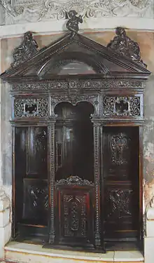 In 1831, the wooden compass of the side entrance was built by carpenter Giovanni Gozzoli, decorated with carvings and floral motifs. The artifact was then enriched with a yellow monochrome lunette by Giuseppe Teosa, depicting Jesus driving the merchants out of the temple.[62]