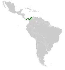 The sapphire-throated hummingbird has a large range, with an estimated distribution size of 88,900 km2.[1] Although the global population size has not been calculated, it is described to be patchy.[1] Overall, the hummingbird is found throughout Panama, Colombia and most recently Costa Rica. The nominate subspecies Chrysuronia coeruleogularis coeruleogularis can be found in Pacific western Panama, ranging from Chiriquí to Canal Zone.[7][12] The subspecies Chrysuronia coeruleogularis confinis is more specifically found on the Caribbean slope in eastern Panama and north-west Columbia.[7][12] Whereas the subspecies Chrysuronia coeruleogularis coelina is more specifically found in the northern parts of Colombia, from north Chocó through Ciénaga Grande de Santa Marta.[4][7][12]
