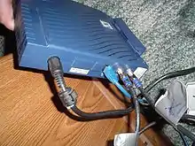 The back panel of a satellite modem, with coaxial connections for both incoming and outgoing signals, and an Ethernet port for connection