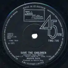 "Save the Children" is a song written by Al Cleveland, Renaldo Benson and Marvin Gaye and issued on Marvin's 1971 album, What's Going On. While not issued as a single in the United States, the song was issued as a single by the Tamla-Motown label in the United Kingdom where it peaked at No. 41 on the charts in December 1971, whereas the other major US single releases initially failed to chart in Europe.[1]