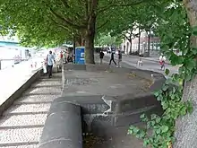 The Schlachte became an important harbour for the city after silting prevented the use of the Balge as a harbour. Today the stone foundations of a large crane are preserved on the Schlachte promenade along the River Weser. A plaque explains the history of the cranes.