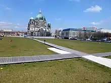 Schloßplatz (German for "Palace Square" or "Castle Square") is a square located on Museum Island (Museumsinsel) in Berlin, Germany. It measures about 225 m by 175 m, with its long side oriented on an axis approximately southwest/northeast. At its west corner is the Schlossbrücke (Palace Bridge), from which Unter den Linden leads west to the Brandenburg Gate. From the same corner, Karl-Liebknecht-Straße runs northeast alongside the square and on to Alexanderplatz. Until the early 20th century, only the square south of the palace was so named, the square north of it being the Lustgarten.