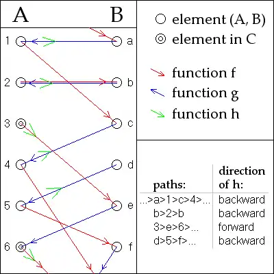 Assume without loss of generality that A and B are disjoint. For any a in A or b in B we can form a unique two-sided sequence of elements that are alternately in A and B, by repeatedly applying and to go from A to B and and to go from B to A (where defined; the inverses and are understood as partial functions.)