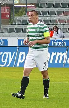 Brown was booked in Celtic's penultimate league game against Kilmarnock, which caused him to go over the disciplinary points threshold and receive a suspension for the first two matches of the 2011–12 season.[86] Brown helped Celtic to the 2011 Scottish Cup Final, which Celtic won 3–0 against Motherwell. This allowed him to collect his first trophy as Celtic captain.[87] Brown played 39 times for Celtic, scoring four goals, during the 2010–11 season.[88] He was often used on the right of midfield, partly due to the form of other central midfielders such as Beram Kayal, Joe Ledley and Ki Sung-Yueng, but also because Brown is more able to play in wide areas than them.[89]