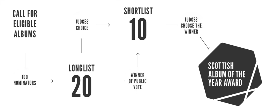 The Longlist is then whittled down to a Shortlist of 10 albums, one of which will be chosen by music fans via an online public vote and the others decided by the SAY Award judging panel. Previous judges have included the composer Craig Armstrong, Turner Prize-winning artists Douglas Gordon and Susan Philipsz, filmmaker Lynne Ramsay, music editor of The Skinny Tallah Brash, DJ and promoter Sarra Wild, Edinburgh International Festival director Fergus Linehan, Sub Club partner/director Barry Price, and Scottish Ballet's Sophie Laplane.