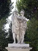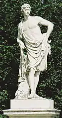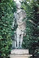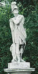 | 32 | Gaius Mucius Scaevola | Johann Martin Fischer | Gaius Mucius Scaevola was a legendary Roman youth known for his bravery. During the siege of Rome by King Lars Porsena of Clusium at the end of the sixth century BC, Scaevola entered the enemy's camp and attempted to kill the king. When he was taken prisoner and threatened with death, Scaevola placed his right hand into a fire to show his indifference to death. Porsena was so impressed he freed the brave youth, who took on the cognomen Scaevola meaning "left-handed".[39] | ![]() |