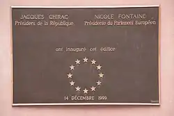 ![]() Plaque commemorating the inauguration of the Louise Weiss Building of the European Parliament in Strasbourg on 14 December 1999, by President of France, Jacques Chirac, and President of the European Parliament, Nicole Fontaine | |
