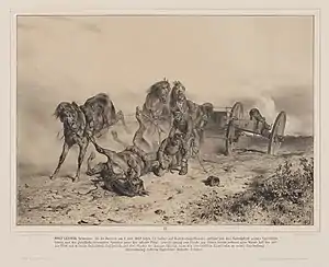 Inferior in numbers and lacking artillery support, the inexperienced units were pushed back and began to flee in disorder.[44] Seeing the Landwehr battalion's success, the other Austrian battalions began to pursue the Hungarians; as they approached to 1.5 km (0.93 mi) from the Hungarian fortified encampment, its 12- and 24-pounder cannons had an effect. This did not stop the Reischach brigade, which continued pursuing the Hungarians as Reischach responded to the cannons with rockets.[45] Although Haynau forbade him to attack Komárom's trenches and defensive works, Reischahch did not halt his brigade; he ordered the two battalions of jägers, the first battalion of the Parma infantry regiment and the Landwehr battalion to lead the attack.[46]