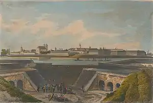 The Austrians occupied a portion of the Hungarian defensive works which preceded the fortress itself, and chased the Hungarians from the vineyards.[47] The first Austrian battalion neared the first fortification and, after strong cannon and gunfire, retreated behind a nearby hill.[48] The Parma infantry occupied a Hungarian trench with cannons, and turned them on the fleeing Hungarians.[48] Two companies of the sixth jäger battalion charged with bayonets, occupying two trenches in front of the fortress, and the third company captured a Hungarian howitzer. Here they were hit by harsh cannon and gunfire from the first fortification, causing them to retreat in disorder behind the same hill in the protection of which the Parma infantry retreated earlier. Three small defences in front of the first fortification remained in the hands of the Reischach brigade, which seized two 12-pound and one 18-pound cannons, one mortar, and an ammunition wagon.[48] To keep the defences, the Bianchi brigade sent its five 12-pound battery and Lieutenant General Lichtenstein too sent there a cavalry battery.[48]