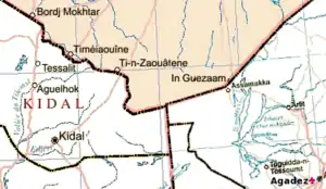 In March 2006, Malian army officer Hassan ag Fagaga, of Tuareg origins, defected from his post with a number of his men, also of Tuareg origins, On 17 May, an attack was launched on the Malian Army at Tin Zawaten, near the meeting of the Mali, Algerian, and Niger borders.[47] On 22 May 2006, a number of former Tuareg rebel, including Hassan ag Fagaga and Ibrahim ag Bahanga intensified their campaign with the simultaneous seizing of arms and material from the military bases in Menaka and Kidal, after which the assailants took to the former rebel bases from the 1990s in the Tigharghar mountains of the Kidal region.[48]