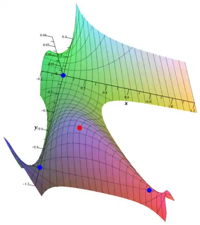 Thus, the second partial derivative test indicates that f(x, y) has saddle points at (0, −1) and (1, −1) and has a local maximum at since . At the remaining critical point (0, 0) the second derivative test is insufficient, and one must use higher order tests or other tools to determine the behavior of the function at this point. (In fact, one can show that f takes both positive and negative values in small neighborhoods around (0, 0) and so this point is a saddle point of f.)
