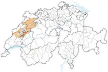 The region is at the boundary of the cantons of Bern, Fribourg, Neuchâtel, and Vaud, forming part of the linguistic boundary region between French- and German-speaking Switzerland.